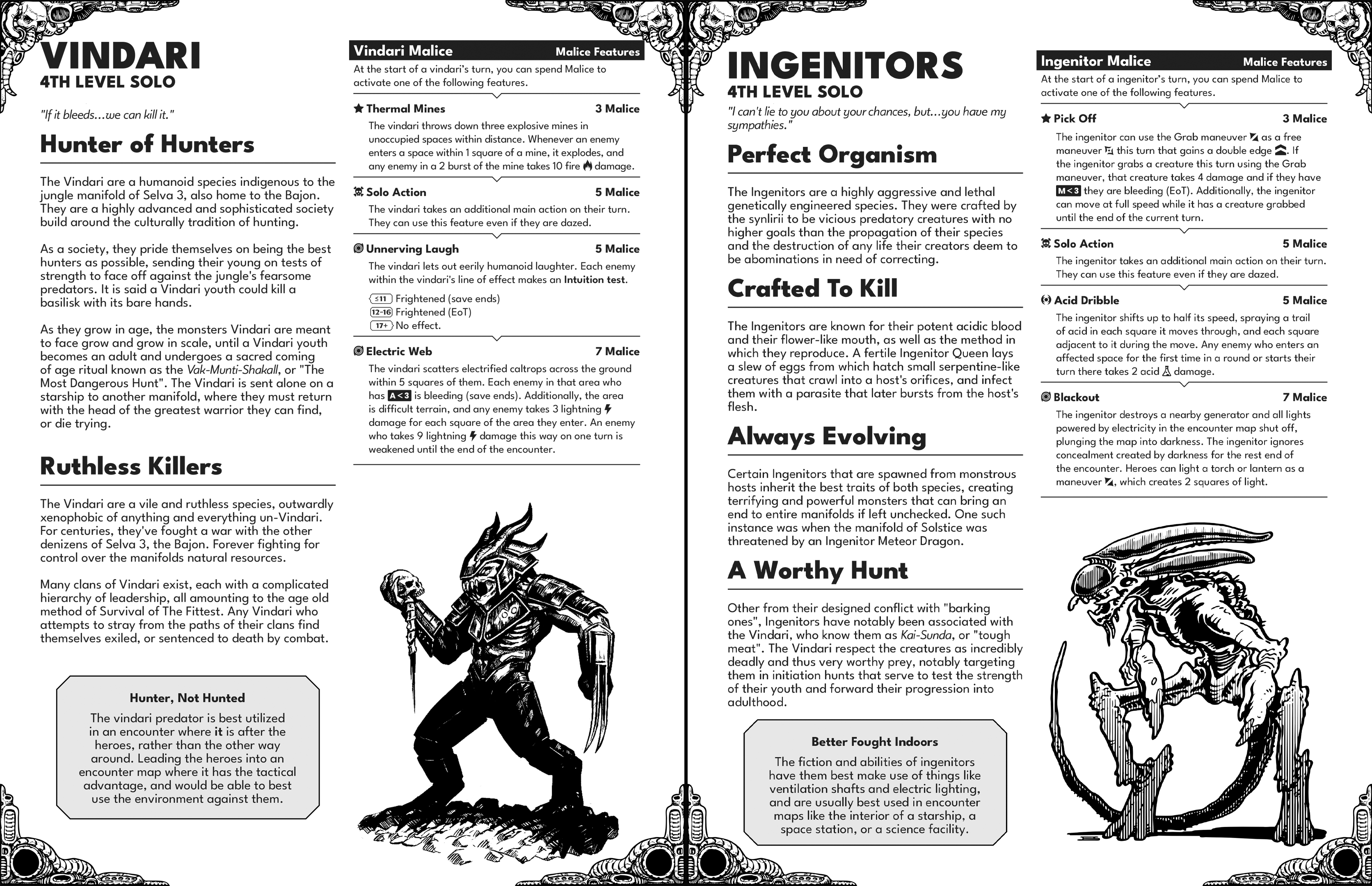 - 2 new 4th level alien solo monsters, the Vindari Predator and the Ingenitor Alien